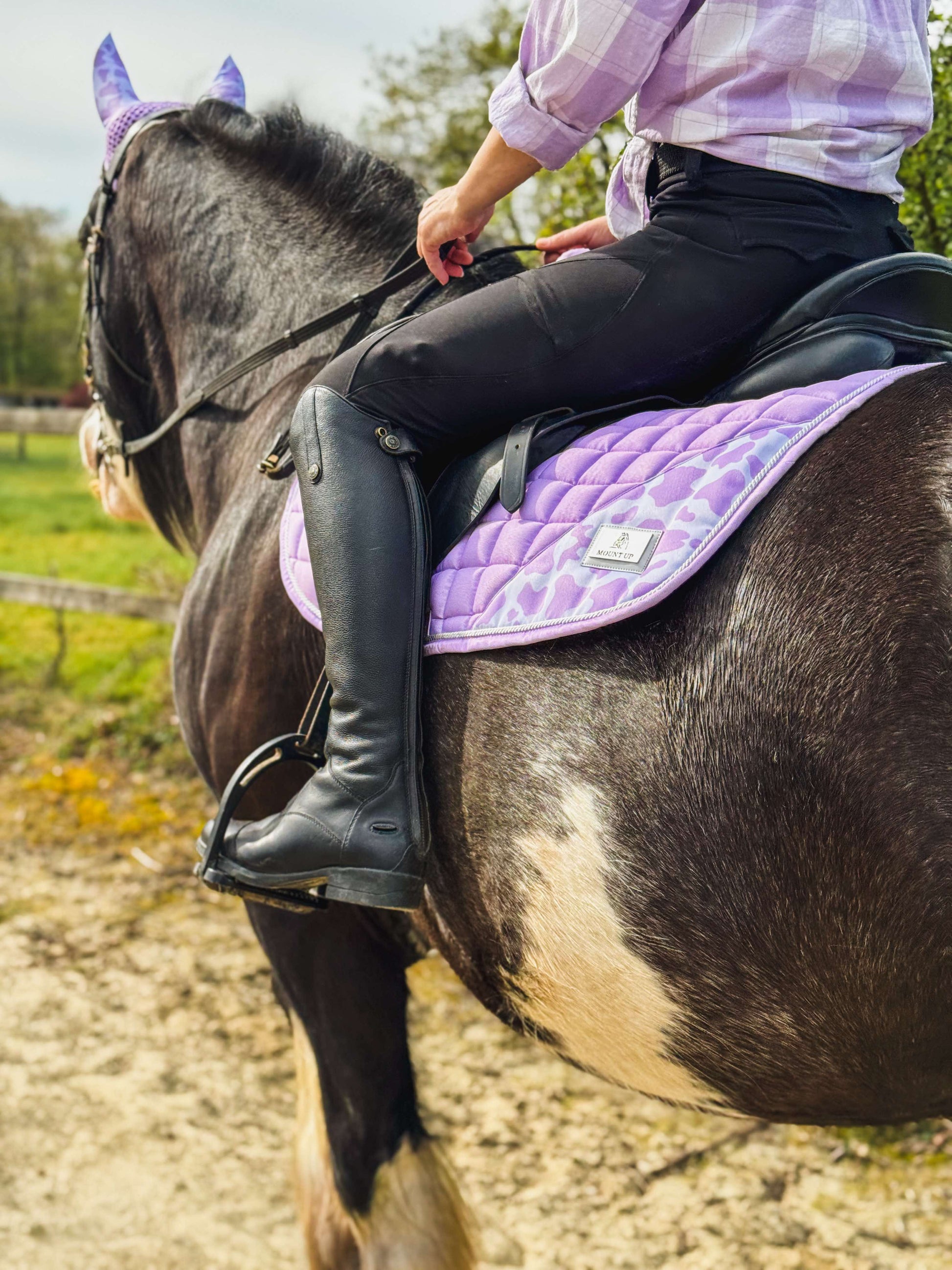 Indulge in the rural charm with our very own Parma Violet Cow Print Saddle Pad and Ears, only at Mount Up Equestrian. Designed for avid cow lovers, this set is not only visually appealing but also a need. If you share our love for cows, don't miss out.