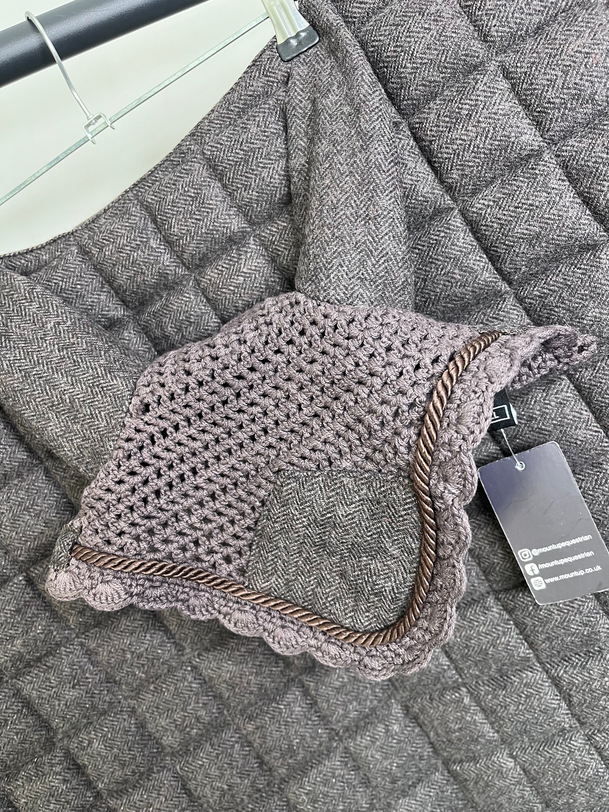 Indulge in the coziness and splendor of the changing seasons with our exclusive Pre Order Chestnut Vale Tweed ear bonnet. Adorned in luxurious chestnut brown tweed and delicate trimmings, this ear bonnet is the perfect addition to your new saddle pad. Don't pass up on this essential piece that effortlessly blends elegance and functionality.
